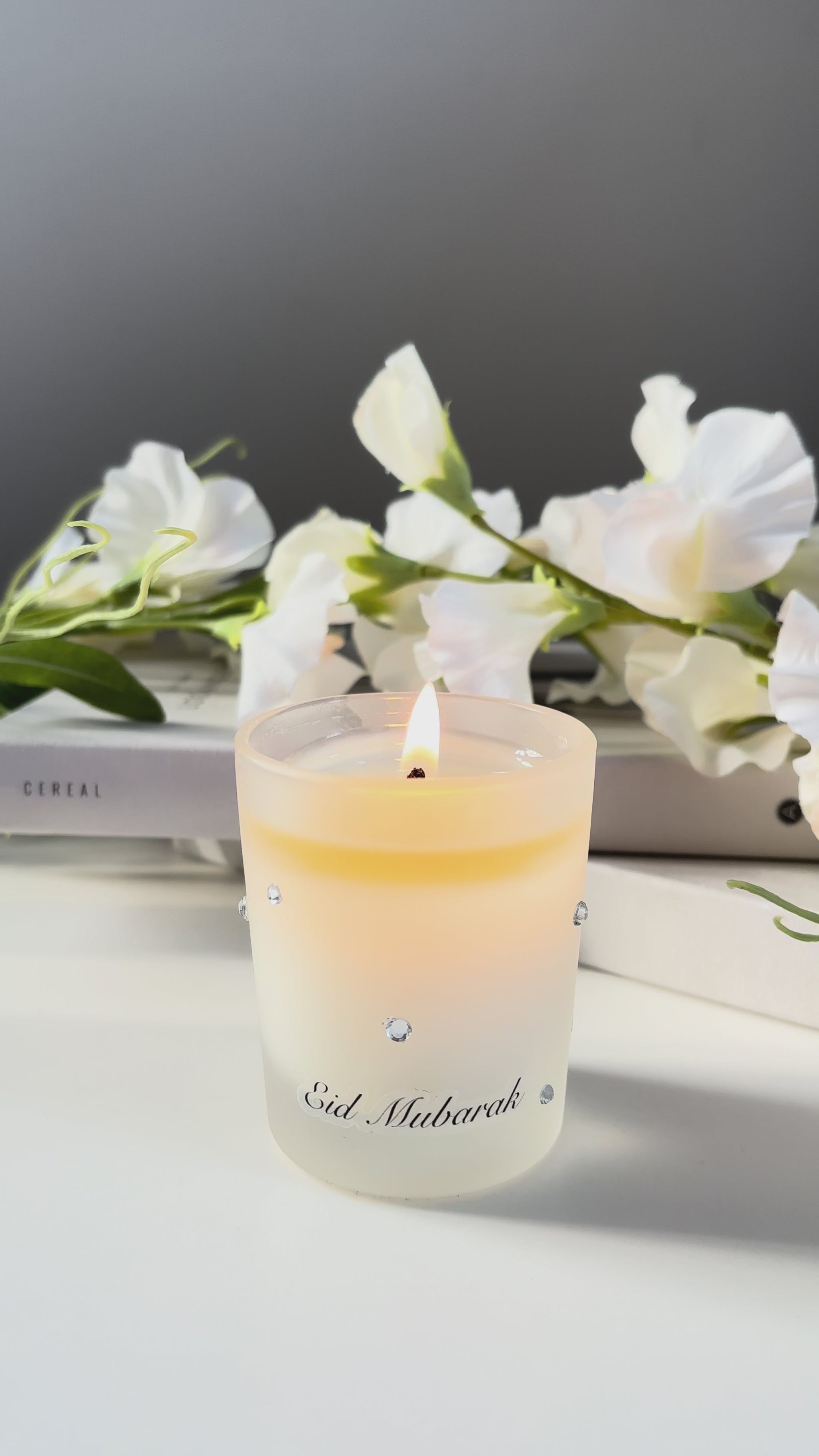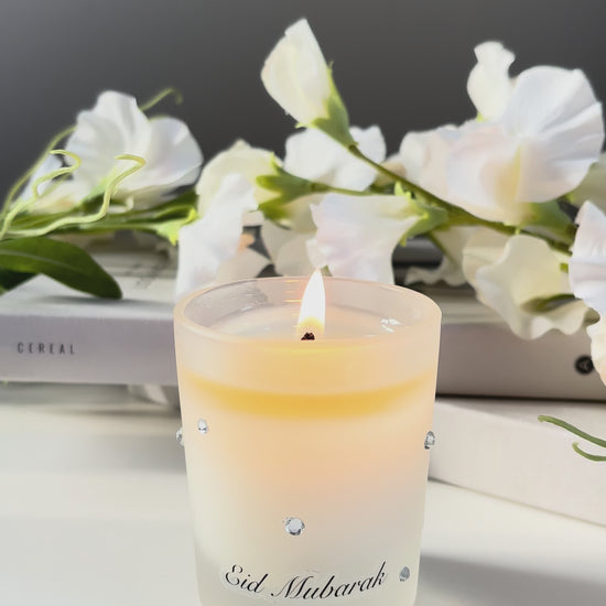 Crafted in a frosted glass vessel and adorned with delicate diamanté details, each crystal reflects like a star — symbolising celebration, gratitude, and illumination after the sacred nights of Ramadan. When lit, the candle emits a soft, warm glow that creates a refined and peaceful atmosphere, perfect for Eid gatherings and gifting.