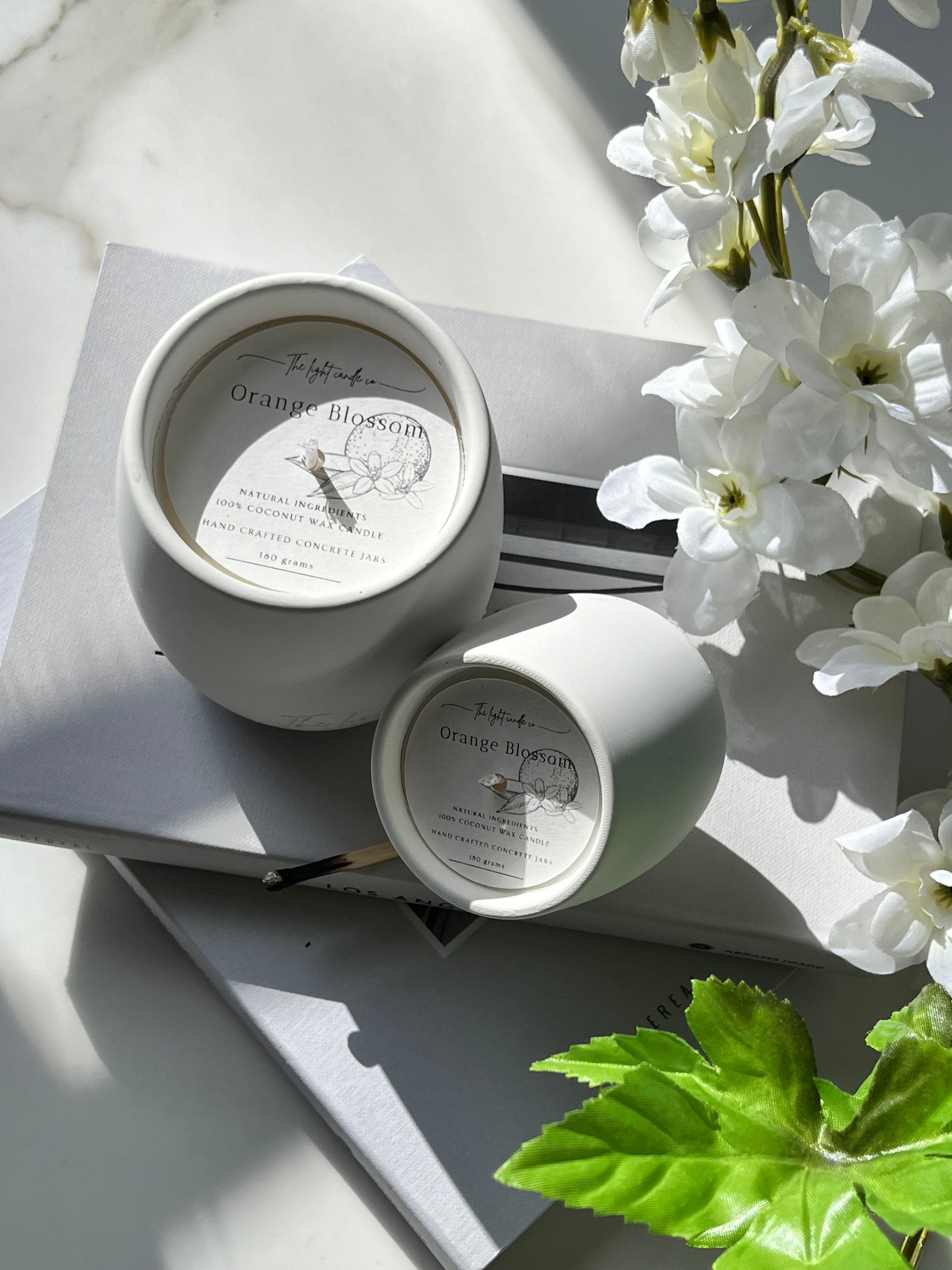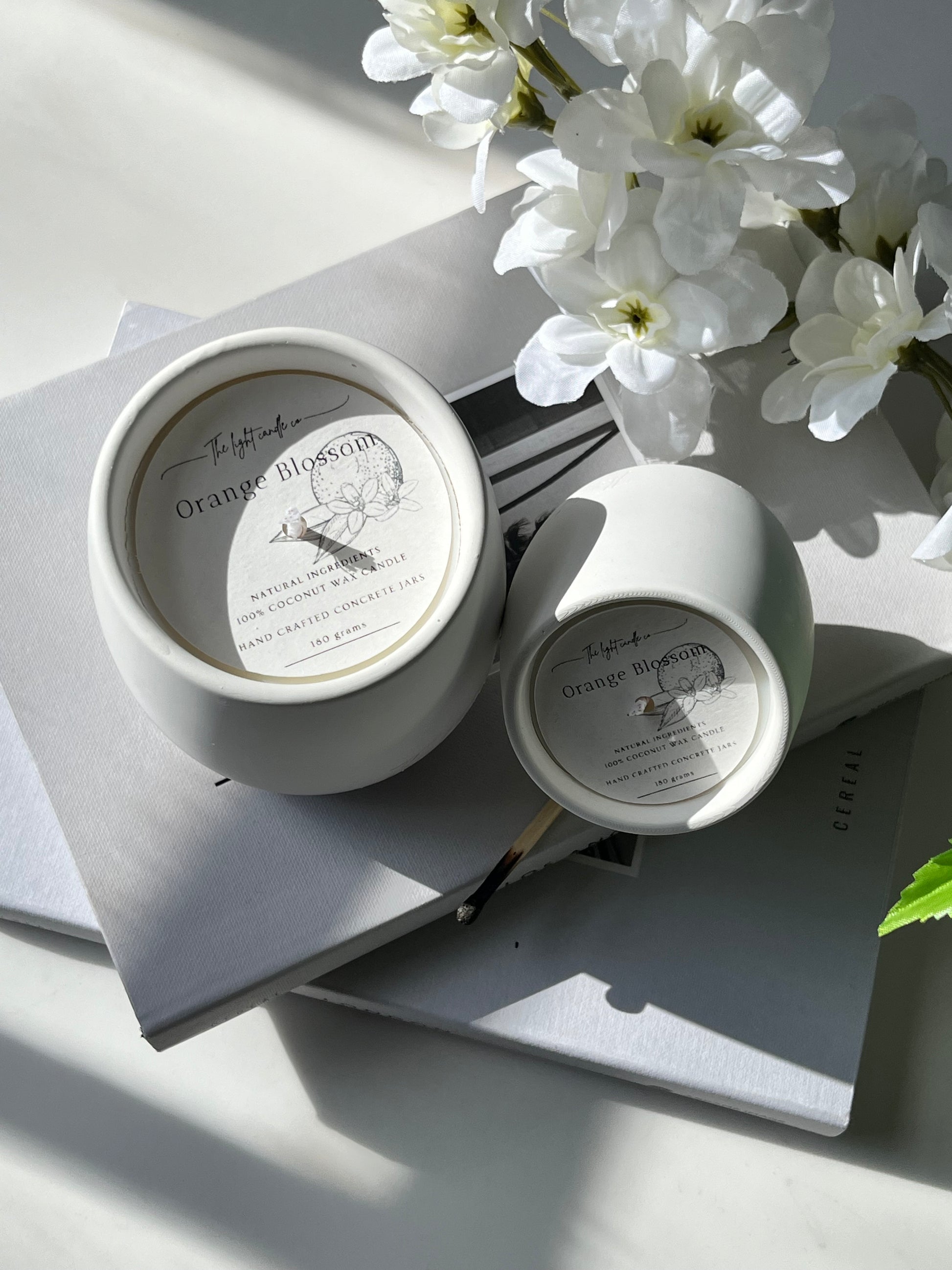 Our Orange Blossom candle - The top notes are myrtle, lavender, bitter orange, lemon, rosemary, mandarin, and bergamot. The middle notes are pittosporum, neroli, jasmine, and African orange flower. The base notes are angelica, ambrette, and amber.